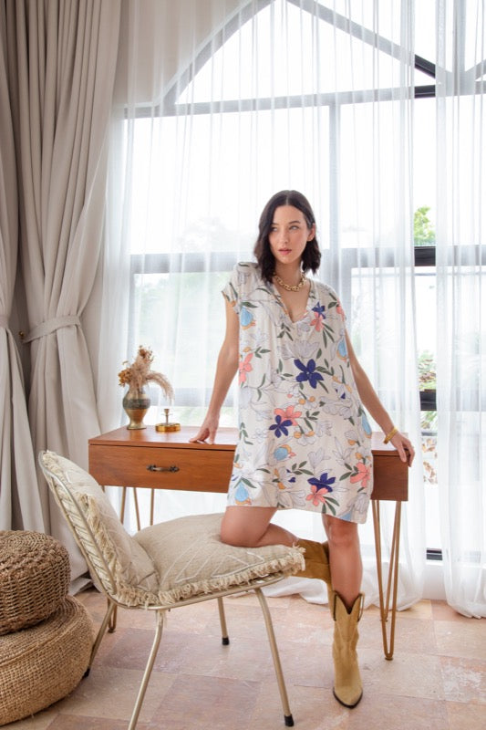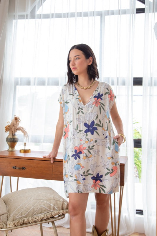 Crafted in our super soft rayon bouquet print with a v-neck, little cap sleeves and pockets, this shift-style dress is the perfect outfit for any occasion.