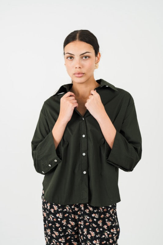 This classic olive poplin shirt features a loose and floaty fit, and a unique big sleeve that can be folded up for a playful touch.