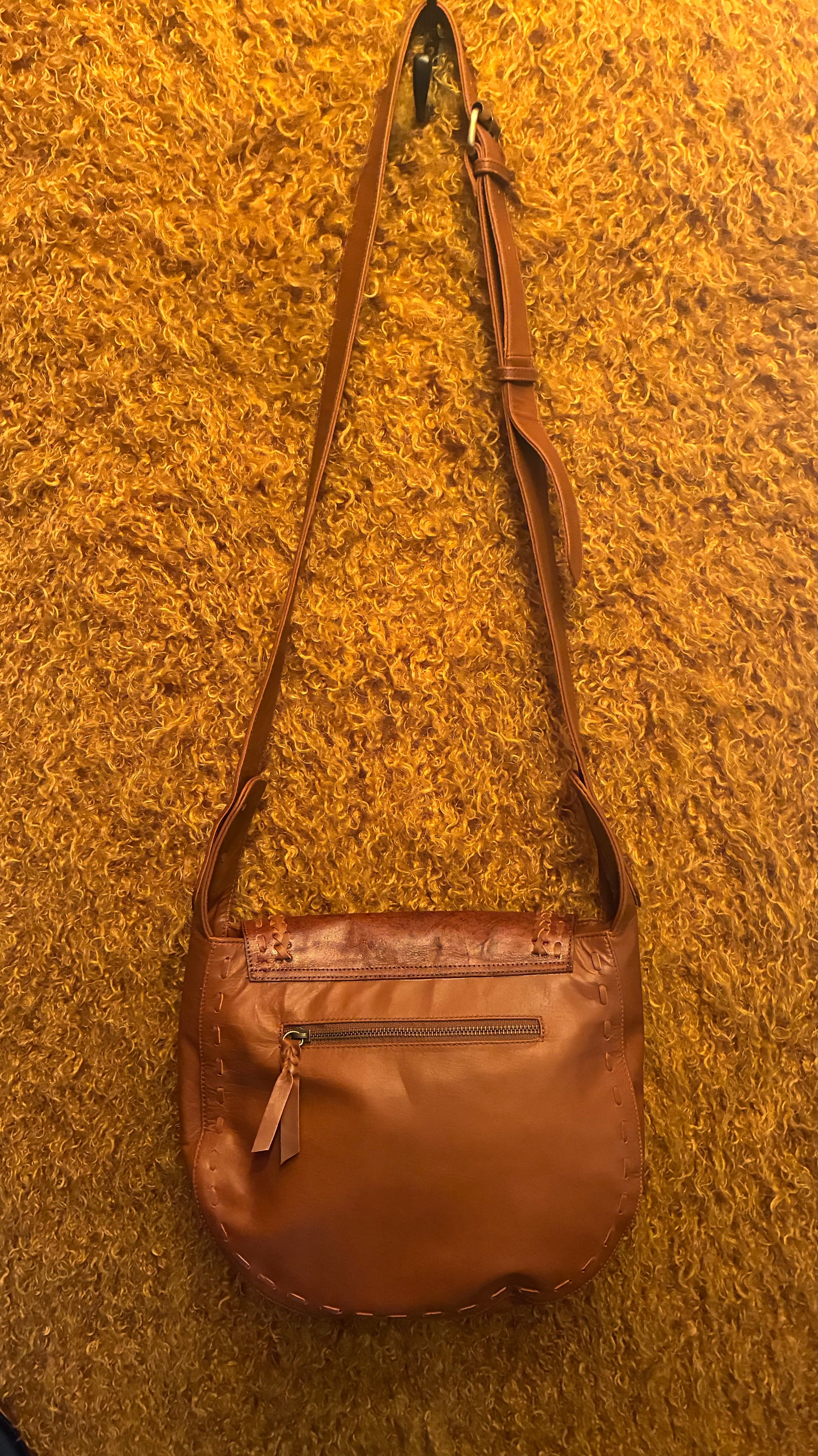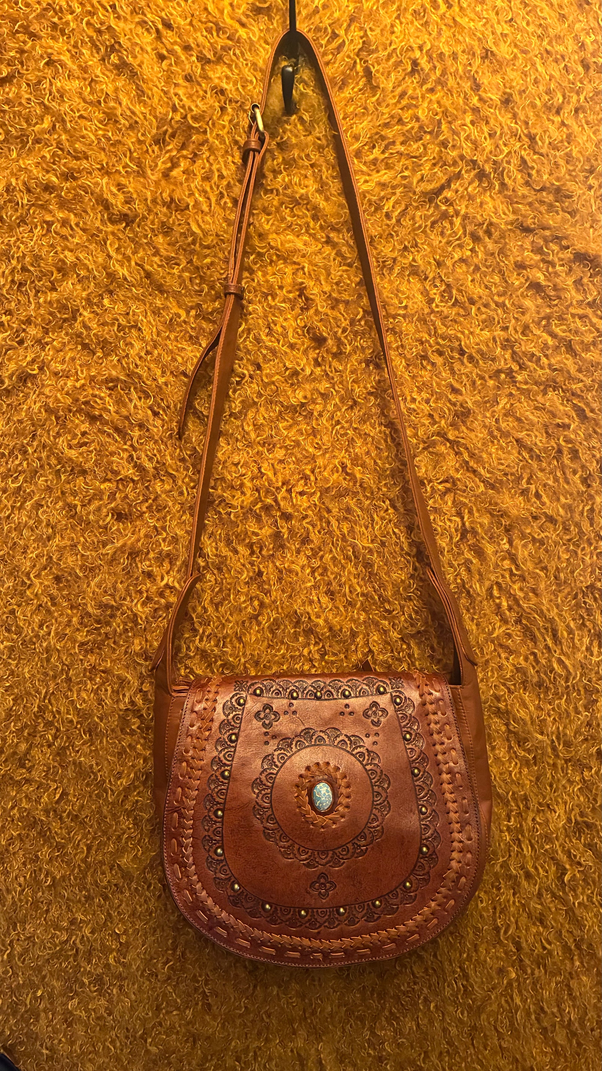 This stunning 70’s style leather bag is carefully handcrafted with etching and stud details, featuring a beautiful turquoise stone. Its fold over front and adjustable strap make it both chic and functional.