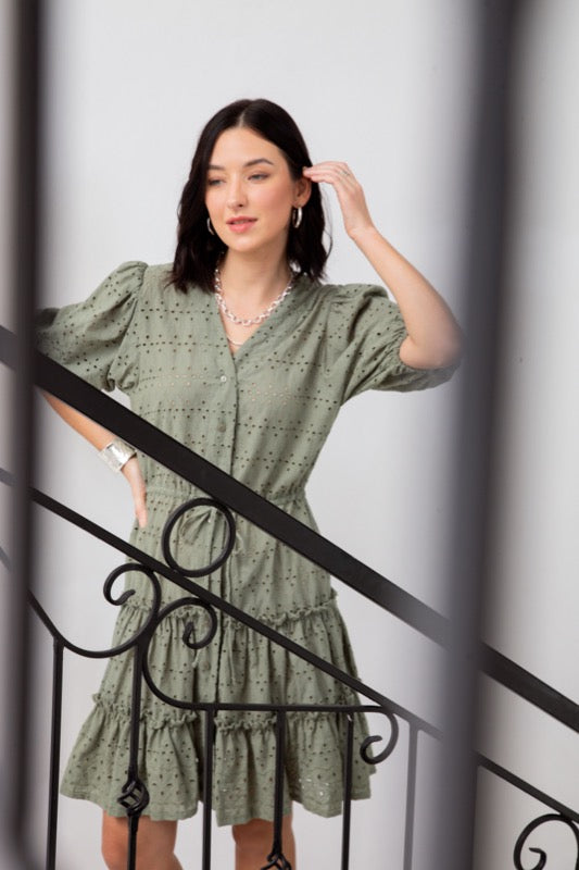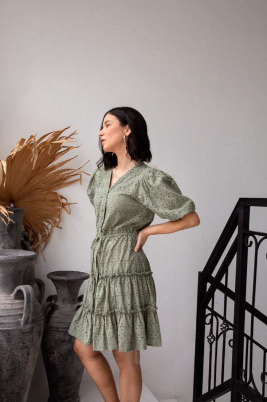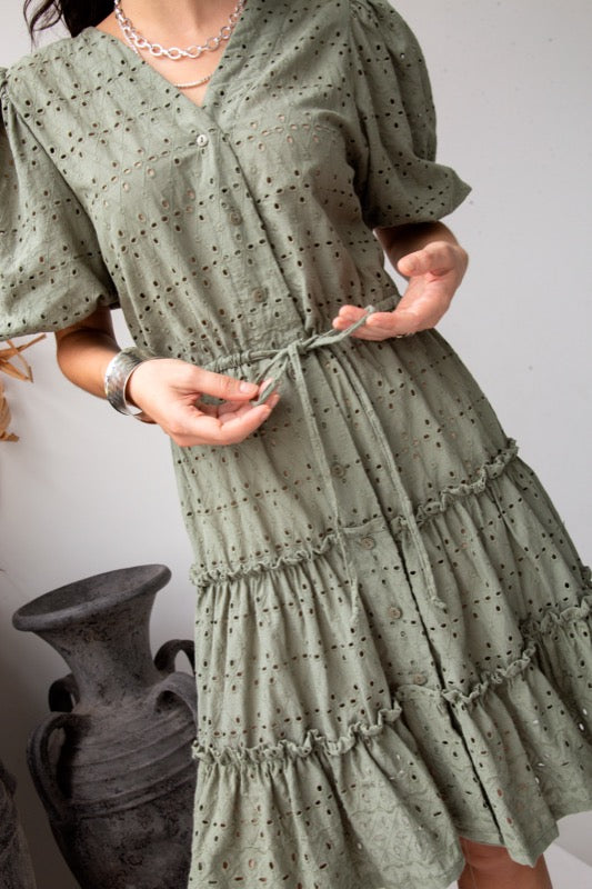 This stunning dress is a button through, drawstring waist, tiered skirt, peasant style sleeves, v-neck and made from our designed embroidery cotton fabric in sage.