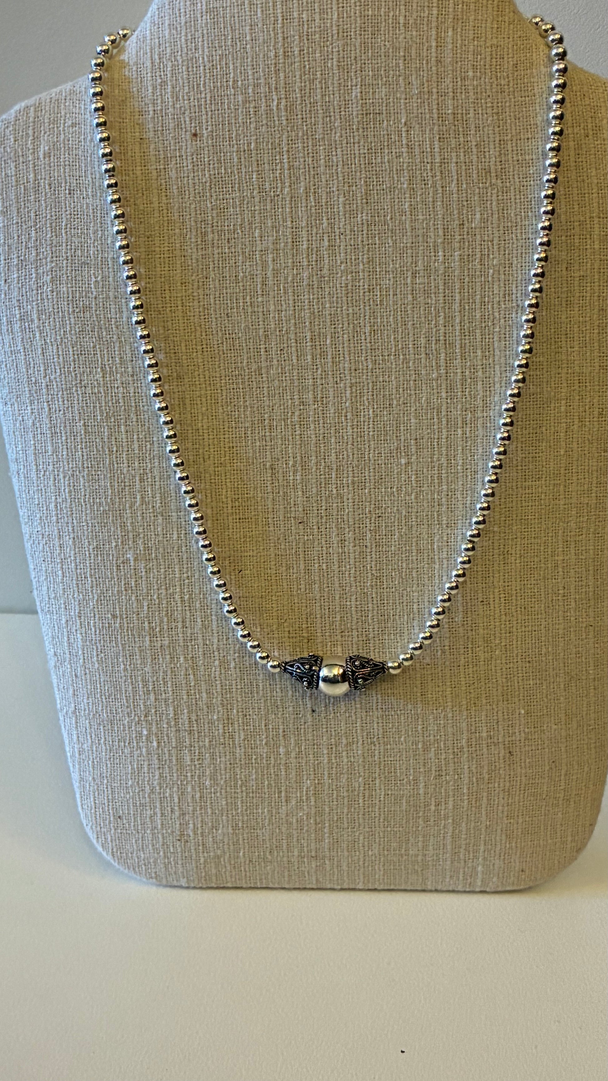 Its intricate silver design includes a spherical charm and a dainty beaded silver chain.